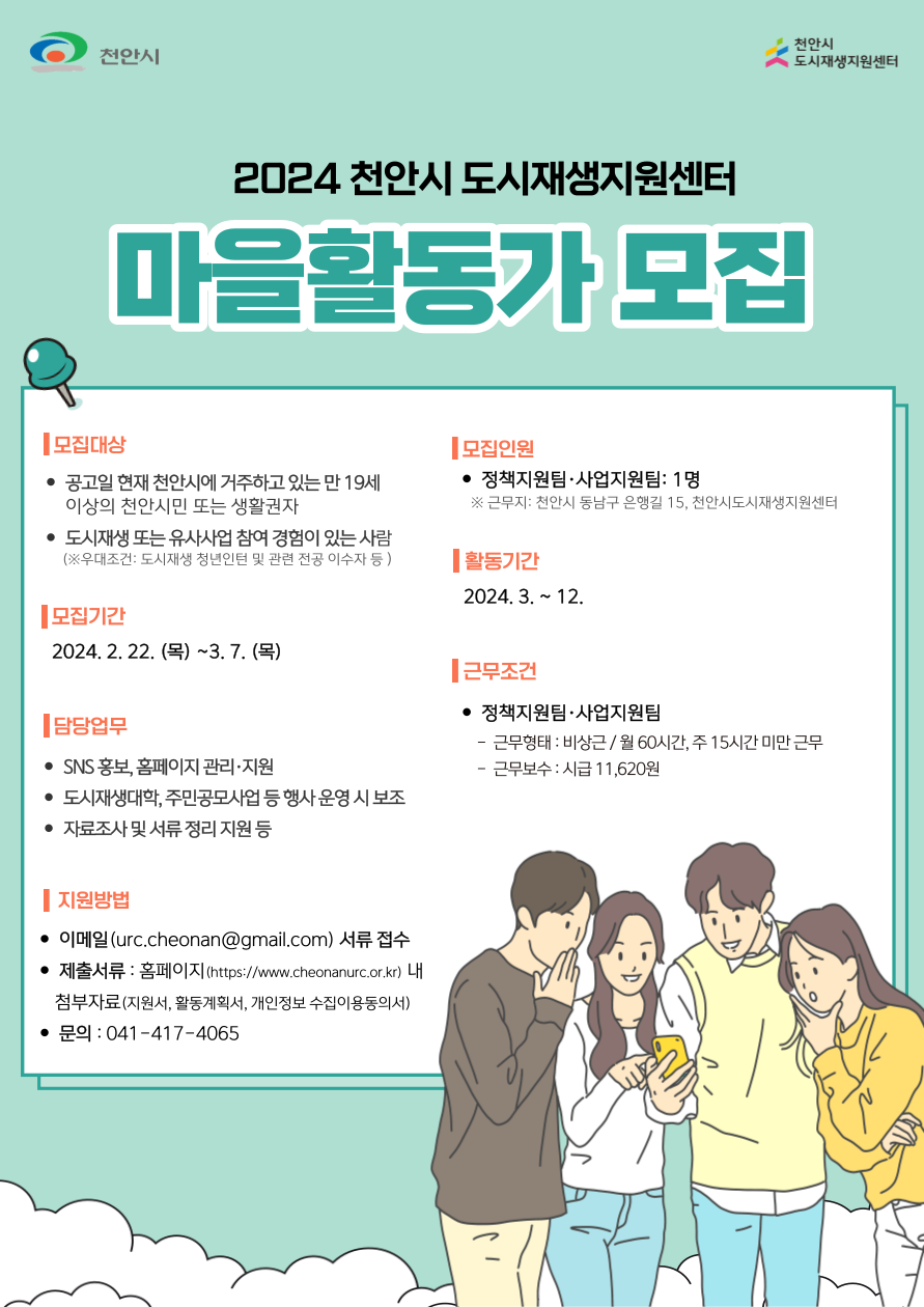 [2024년 천안시 도시재생지원센터 마을활동가 2차 모집]
